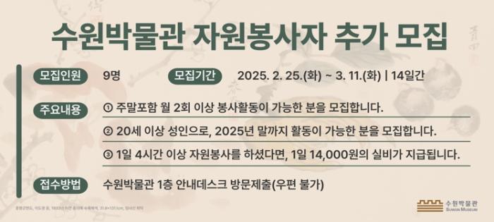• 수원박물관이 3월 11일까지 어린이체험실 운영을 도울 자원봉사자 9명을 추가로 모집한다.