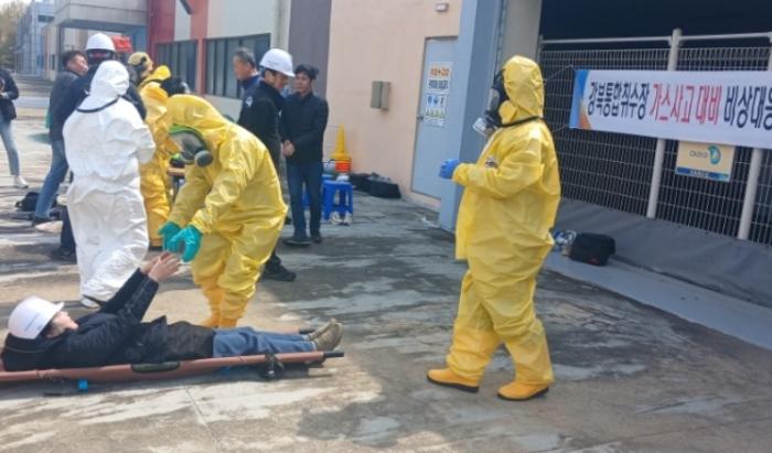 훈련은 사업장에서 고압 염소가스가 대량 누출된 상황을 가정해 진행됐으며, △가스 누출 및 경보 발생 △사고 인지와 주민 대피 전파 △화학구조 및 구급대의 초동 대응 △부상자 구조와 현장 조치 △주민 대피 해제 등 사후 조치 순으로 실시됐다.