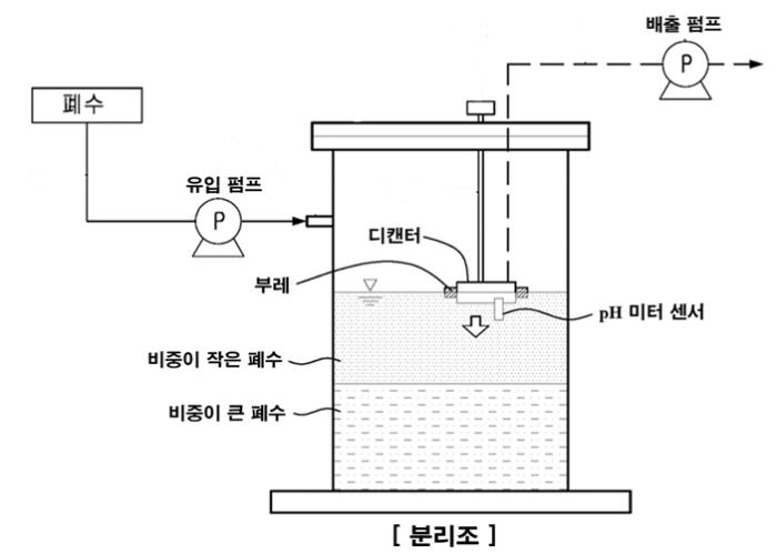 전체 처리 공정은 비중 차로 인해 폐수가 상하로 층 분리되면 디캔터(Decanter)로 상층의 비중이 상대적으로 작은 1차 처리수를 먼저 분리한 후, 하층의 비중이 큰 2차 처리수의 pH를 측정하여 실시간으로 산성 폐수(pH'7)와 염기성 폐수(pH'7)로 각각 분리하여 저장한다.