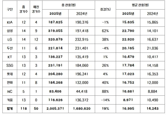구단 별로는 LG가 32만 879명 의 팬이 구장을 찾아 관중 1위를 기록하고 있다. 뒤이어 삼성이 31만 9,055명을 기록해 나란히 30만 관중을 돌파했다. SSG가 23만 1,191명, 두산이 22만 1,814명, 롯데가 20만 4,280명으로 3개 구단이 총 20만 관중을 넘어섰다.