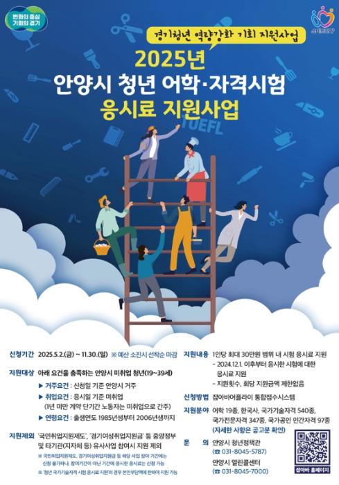 최대호 안양시장은 “이번 지원사업을 통해 취업을 준비하는 청년들의 경제적 부담을 덜고, 다양한 자격증 취득을 통한 취업 경쟁력 강화에 도움이 되길 바란다”며 “앞으로도 청년들의 취업역량 강화를 위한 다양한 지원 정책을 적극 마련하겠다”고 말했다.