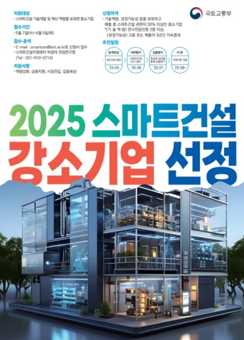 스마트건설 강소기업 선정을 희망하는 기업은 5월 7일부터 6월 5일까지 공고문에 첨부된 신청서를 전자우편으로 제출해야 하며, 공고문 등 자세한 사항은 한국건설기술연구원 누리집에서 확인할 수 있다.