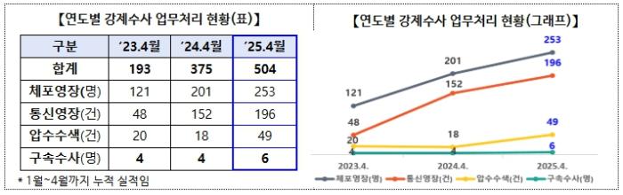 [종합뉴스채널, 홍희주기자] 고용노동부에 따르면 ’25년 4월 기준으로 구속수사, 체포영장 집행 등 강제수사 실적이 504건으로 지난해 같은 시기에 비해 크게 증가(34.4%)한 것으로 확인됐다. 이는 ’23년 4월(193건)과 비교하면 무려 2.6배나 증가한 수치이다.