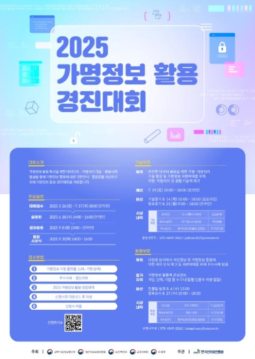 [종합뉴스채널, 최한수기자] 과학기술정보통신부와 개인정보보호위원회는 ‘2025 가명정보 활용 경진대회’ 참가작을 오는 5월 26일부터 7월 17일까지 접수한다고 밝혔다.