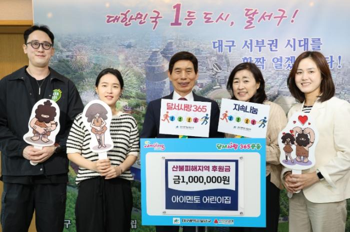 • [종합뉴스채널, 김현성기자] 대구 달서구는 아이멘토 어린이집(원장 이정미)으로부터 산불 피해지역 지원을 위한 후원금 100만 원을 기탁받았다고 26일 밝혔다.