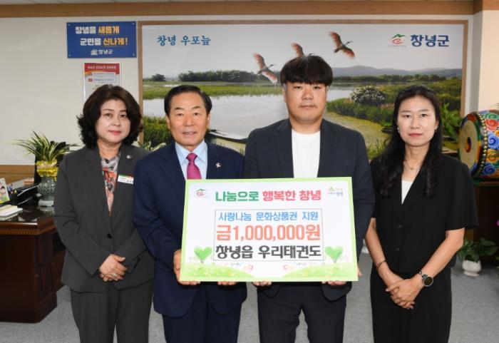 • [종합뉴스채널, 김현성기자] 창녕군은 지난 26일, 창녕읍에 소재한 우리태권도(관장 박상진)에서 관내 저소득 아동의 문화생활 지원을 위해 문화상품권(1만 원권) 100매를 기탁했다고 밝혔다.