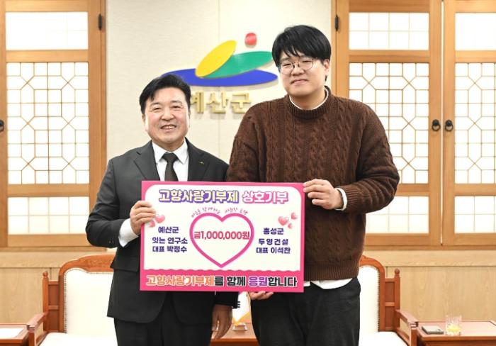 • 예산군은 예산 소재 ‘잇는 연구소’와 홍성군 소재 ‘두영건설’ 대표가 상호 지자체를 응원하며 고향사랑기부금을 상호 기탁했다고 7일 밝혔다.