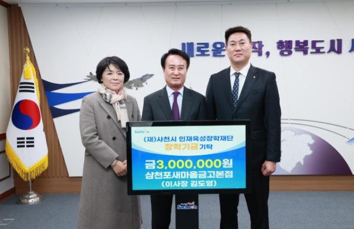 • 사천시는 삼천포새마을금고 김도영 이사장이 사천시청을 방문해 지역 인재 육성을 위한 장학금 300만 원을 사천시 인재육성장학재단에 기탁했다고 7일 밝혔다.