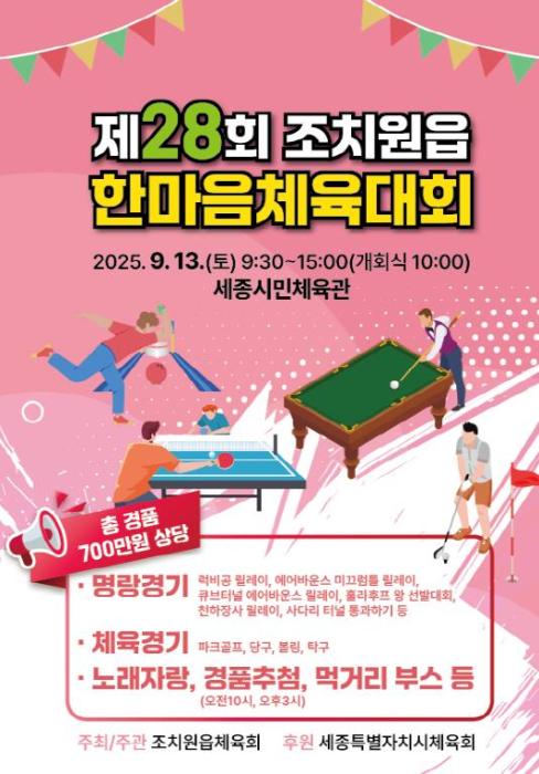 • [종합뉴스채널, 김현성기자] 세종특별자치시 조치원읍체육회가 오는 13일 조치원읍 세종시민체육관에서 ‘제28회 조치원읍 한마음 체육대회’를 개최한다.