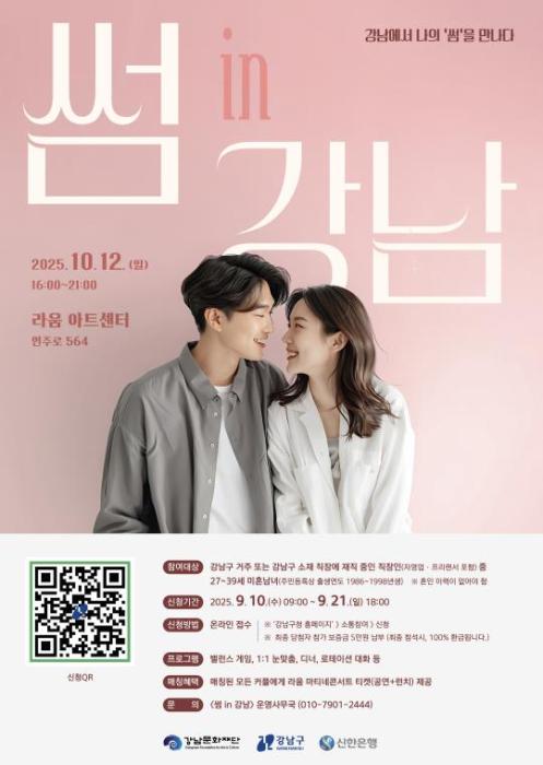 참가 대상은 강남구에 거주하거나 직장을 둔 27세~39세(1998~1986년생)의 미혼남녀로, 남녀 각 50명씩 총 100명을 모집한다. 자영업자, 프리랜서도 지원 가능하다. 신청은 9월 10일 오전 9시부터 21일 오후 6시까지 강남구청 홈페이지(소통참여 ' 신청 ' 썸in강남)에서 하면 된다.