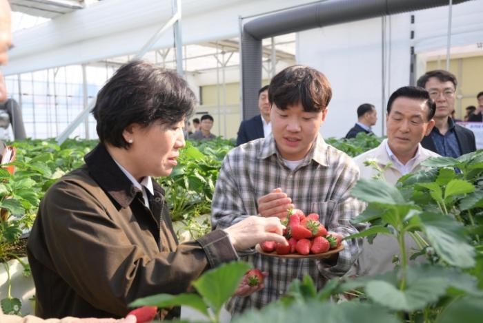 12일 송미령 농림축산식품부 장관과 농협중앙회 강호동 회장, 백성현 논산시장은은 논산시 딸기 스마트팜 농가를 방문하고, 청년 농업인의 의견을 청취하기 위한 간담회를 가졌다.