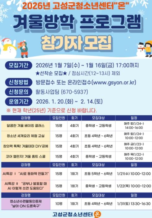 • [종합뉴스채널, 김현성기자] 고성군청소년센터“온”은 겨울방학을 맞이한 관내 청소년들을 대상으로 2026년 1월 20일부터 2월 14일까지 2026년 겨울방학 프로그램 및 특강을 운영한다.
