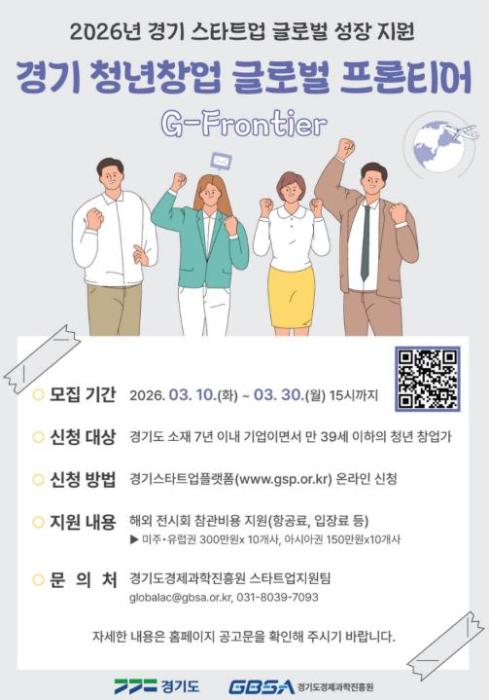 [종합뉴스채널, 최한솔기자] 경기도와 경기도경제과학진흥원은 도내 청년 창업가들의 글로벌 시장 진출의 시작을 돕는 ‘경기 청년창업 글로벌 프론티어(G-Frontier)’ 참여기업 20개사를 오는 30일까지 모집한다.