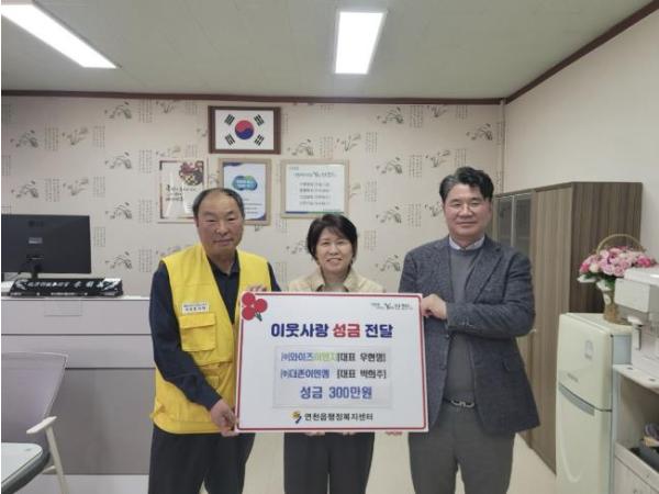 • [종합뉴스채널, 최한솔기자] 연천군 소재 ㈜와이즈이앤지와 ㈜더존이엔엠은 지난 9일 연천읍 행정복지센터를 방문해 관내 어르신들을 위한 경로잔치 준비에 써달라며 성금 300만원을 기탁했다.